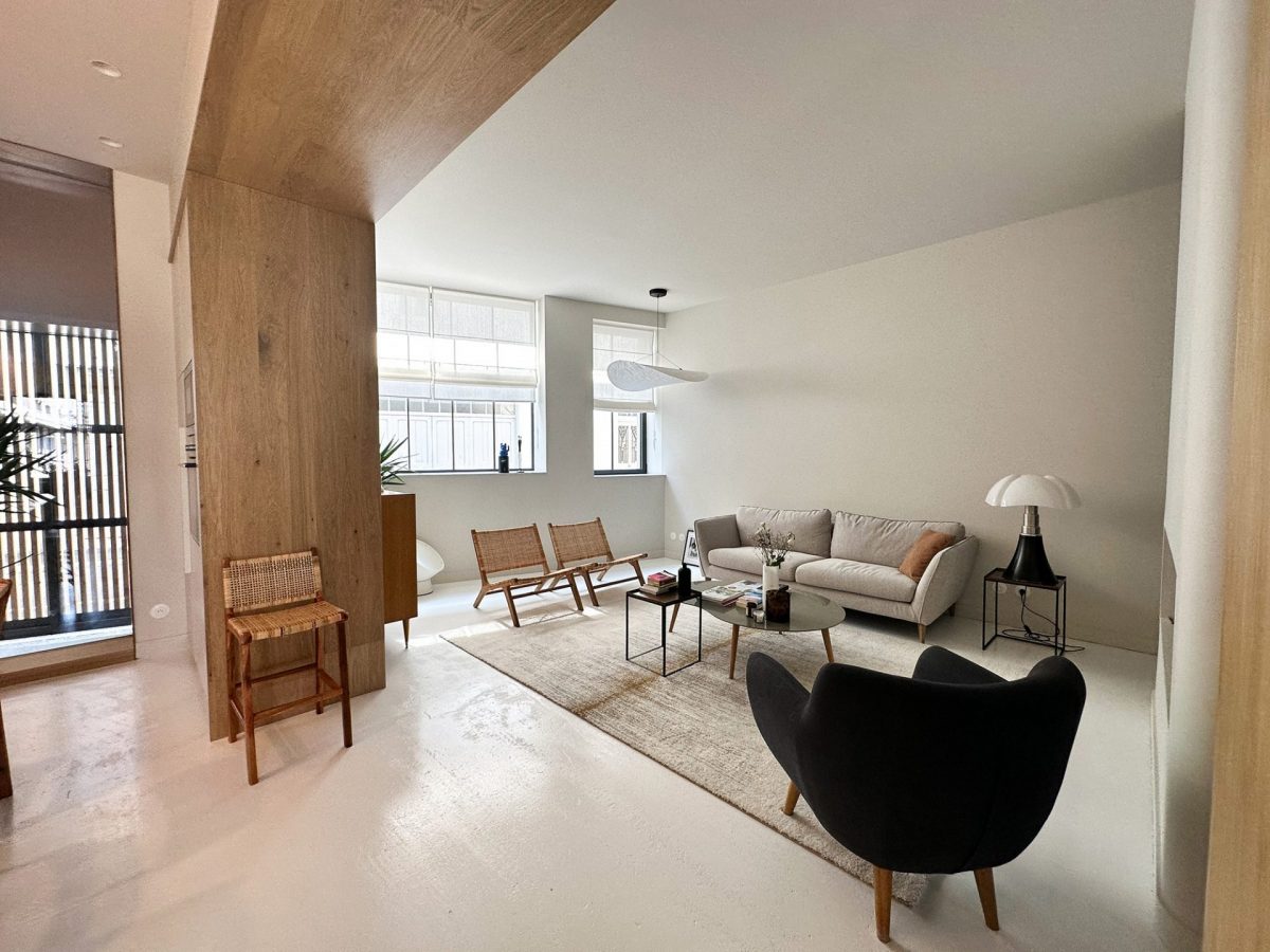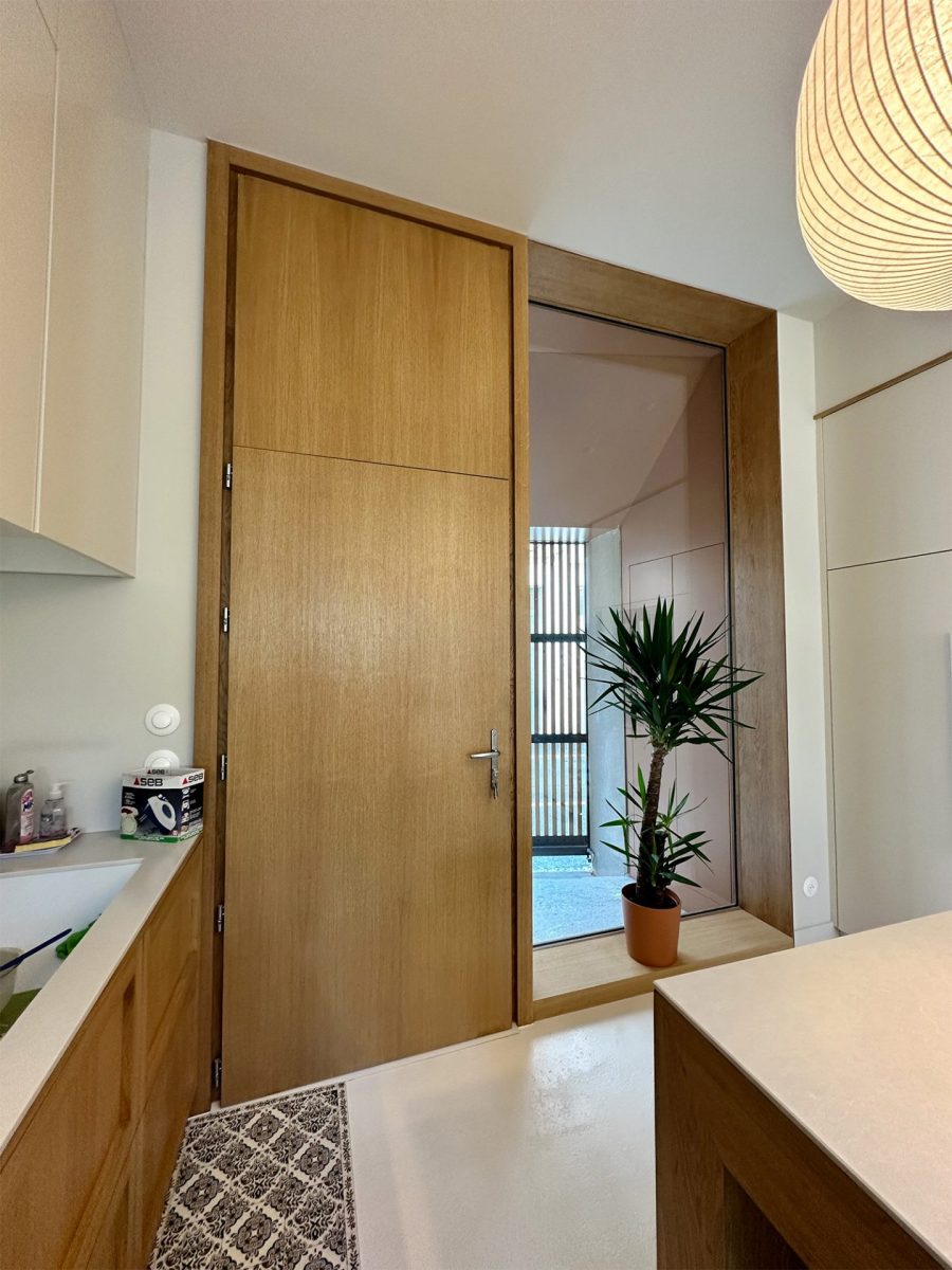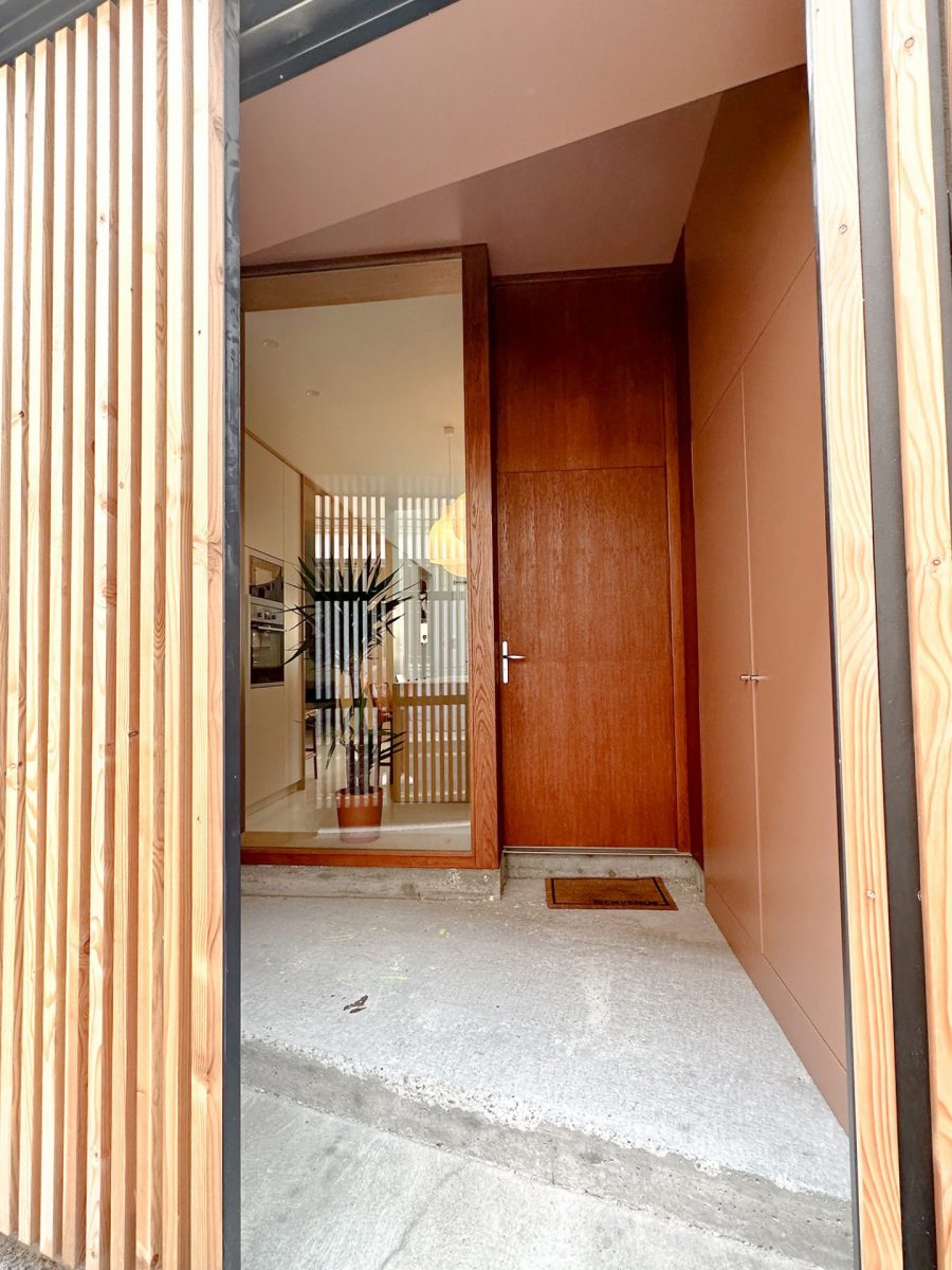 Passée la porte d’entrée bois, parfaitement adaptée au parti pris architectural, un espace de vie à la décoration épurée et soignée s’ouvre à nous.