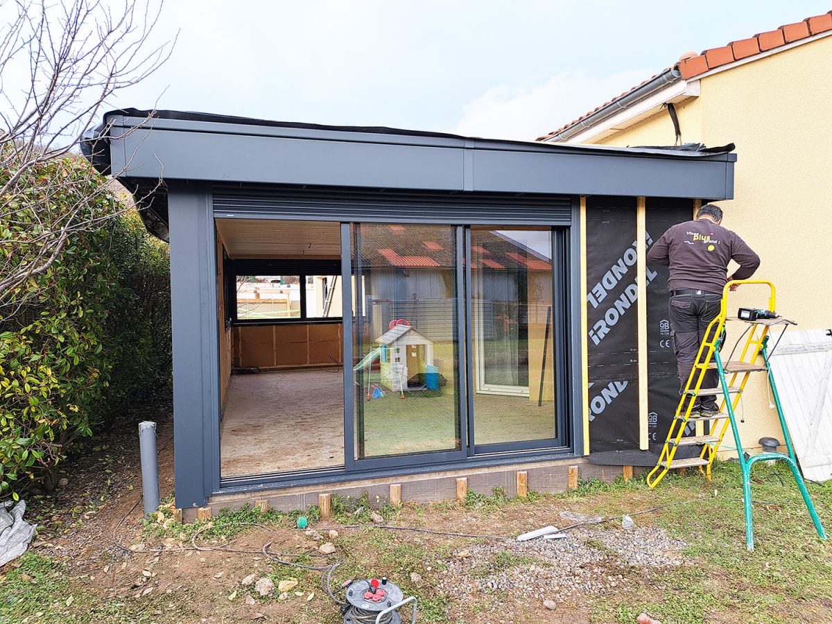 Une extension moderne de 25 m² qui transforme une maison de plain-pied en véritable espace de vie lumineux : salon / salle à manger spacieux, menuiseries aluminium RAL 7016 et finitions haut de gamme.